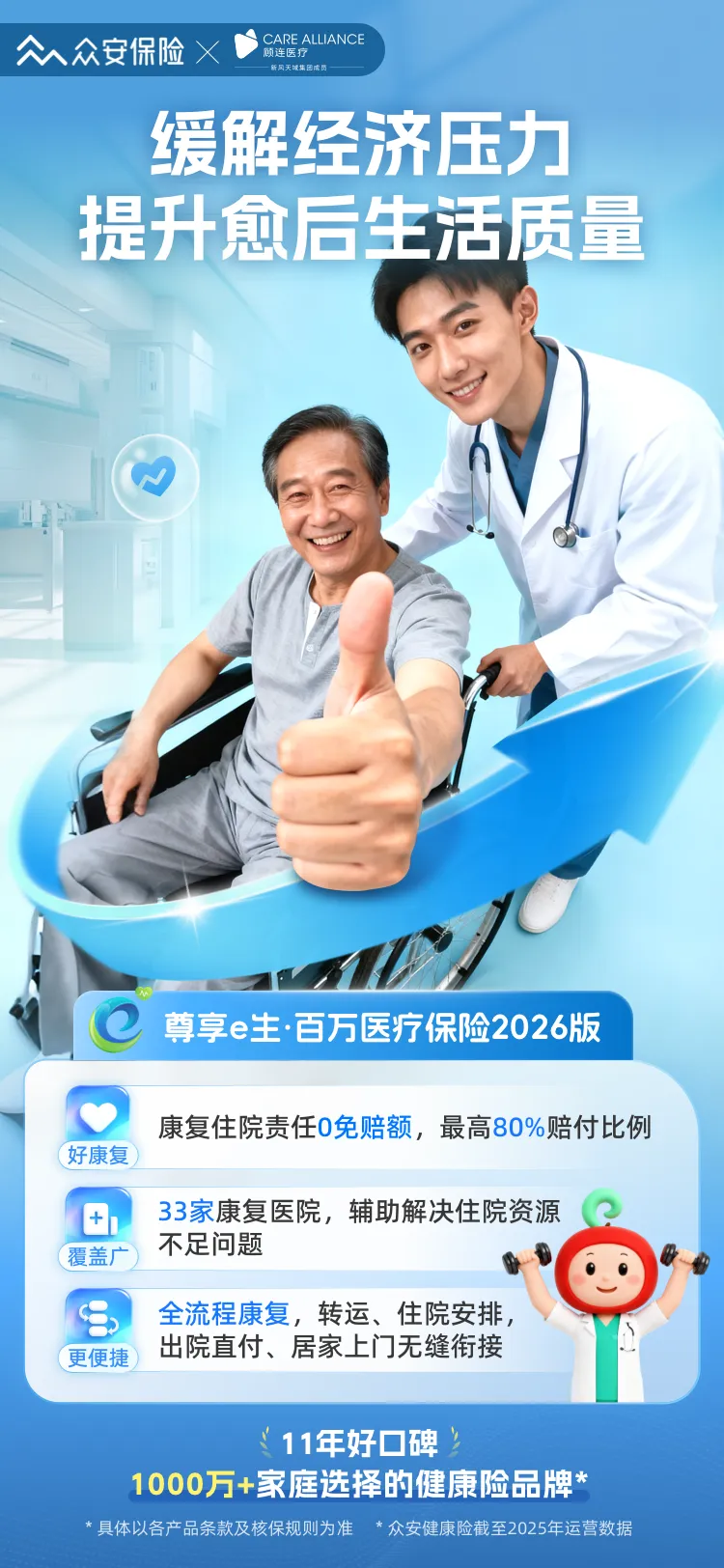 12月17日,众安在线财产保险股份有限公司(以下简称“众安保险”)重磅推出“尊享e生百万医疗险2026”。此次升级最具突破性的亮点在于,首次将“康复住院责任”纳入主流百万医疗险的保障范围,标志着健康险保障正式迈入“急性期治疗-长期康复”的全流程闭环。顾连医疗作为全国性综合康复医疗集团,不仅旗下医院成为首批接入的专业康复医院网络核心成员,更在合作中扮演了关键共创者的角色。